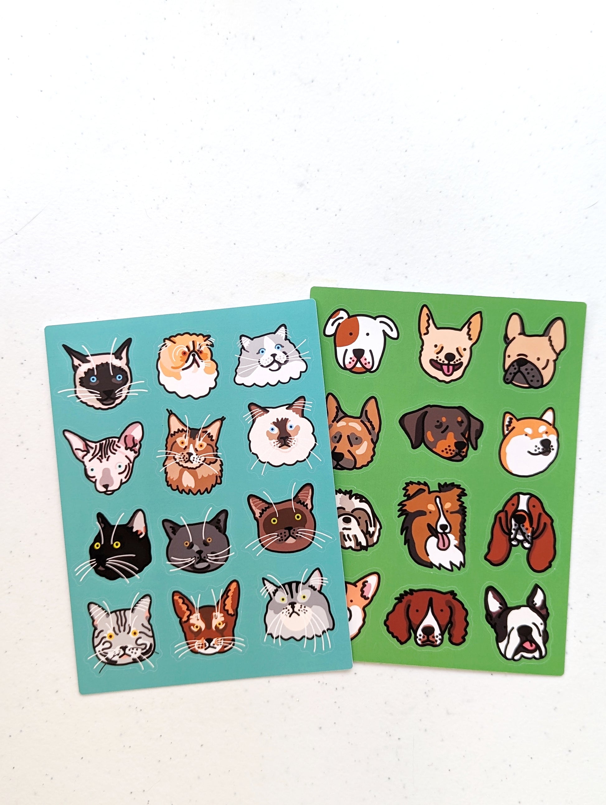 Calling all pet lovers! This adorable sticker sheet set features a charming collection of illustrated cat and dog faces that capture the unique personalities of your favorite furry friends. Each sheet is filled with vibrant, expressive pet portraits—perfect for adding a playful touch to journals, planners, laptop cases, or crafting projects.