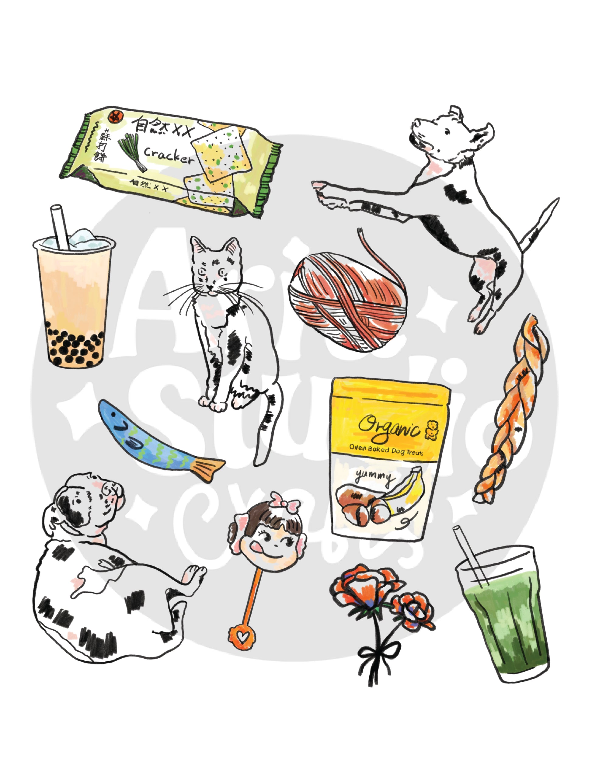 For example, my own design includes boba tea, matcha latte, chocolate lollipops, crackers, yarn, red flowers, my pets, and their favorite treats and toys.