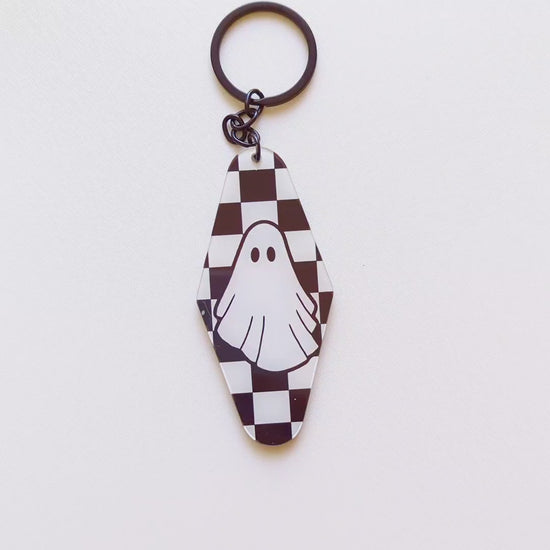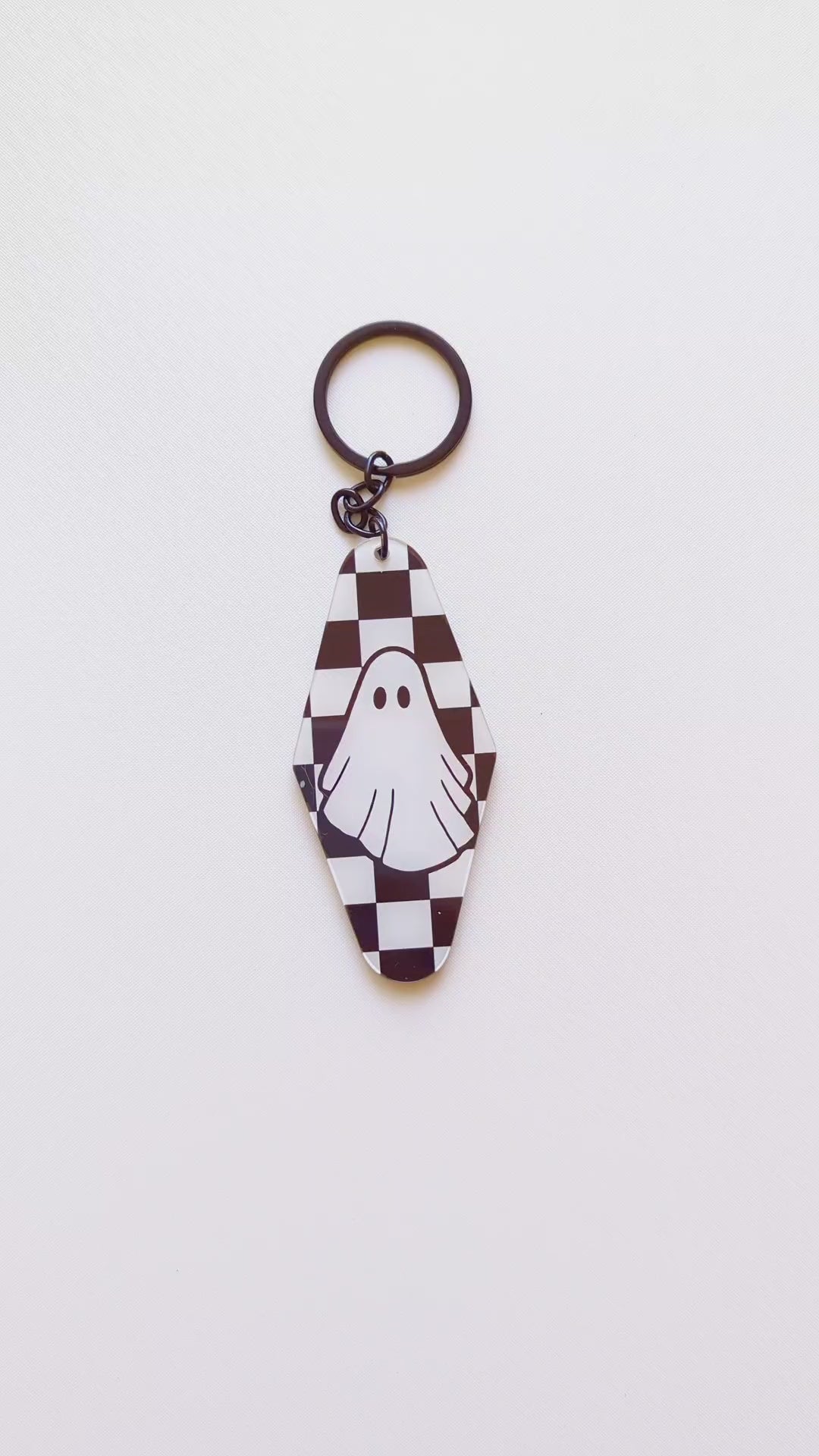 This Halloween Plaid Acrylic Keychain adorable double-sided keychain, each with a fun design on classic black-and-white plaid: