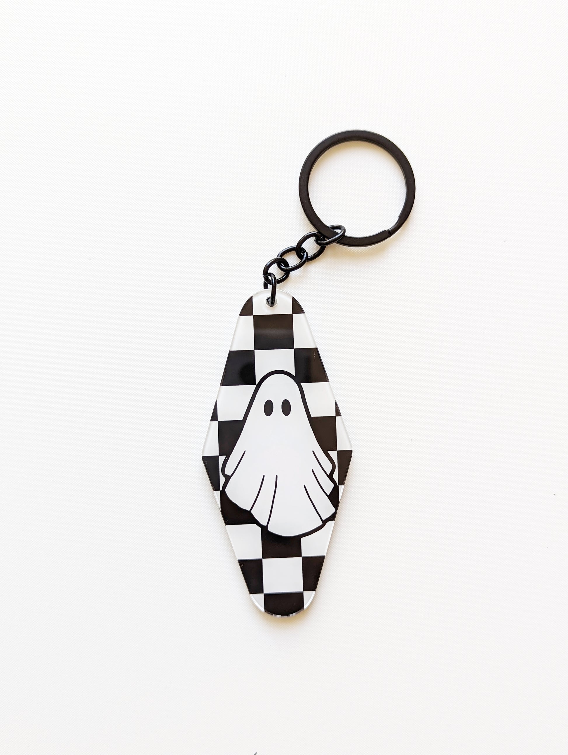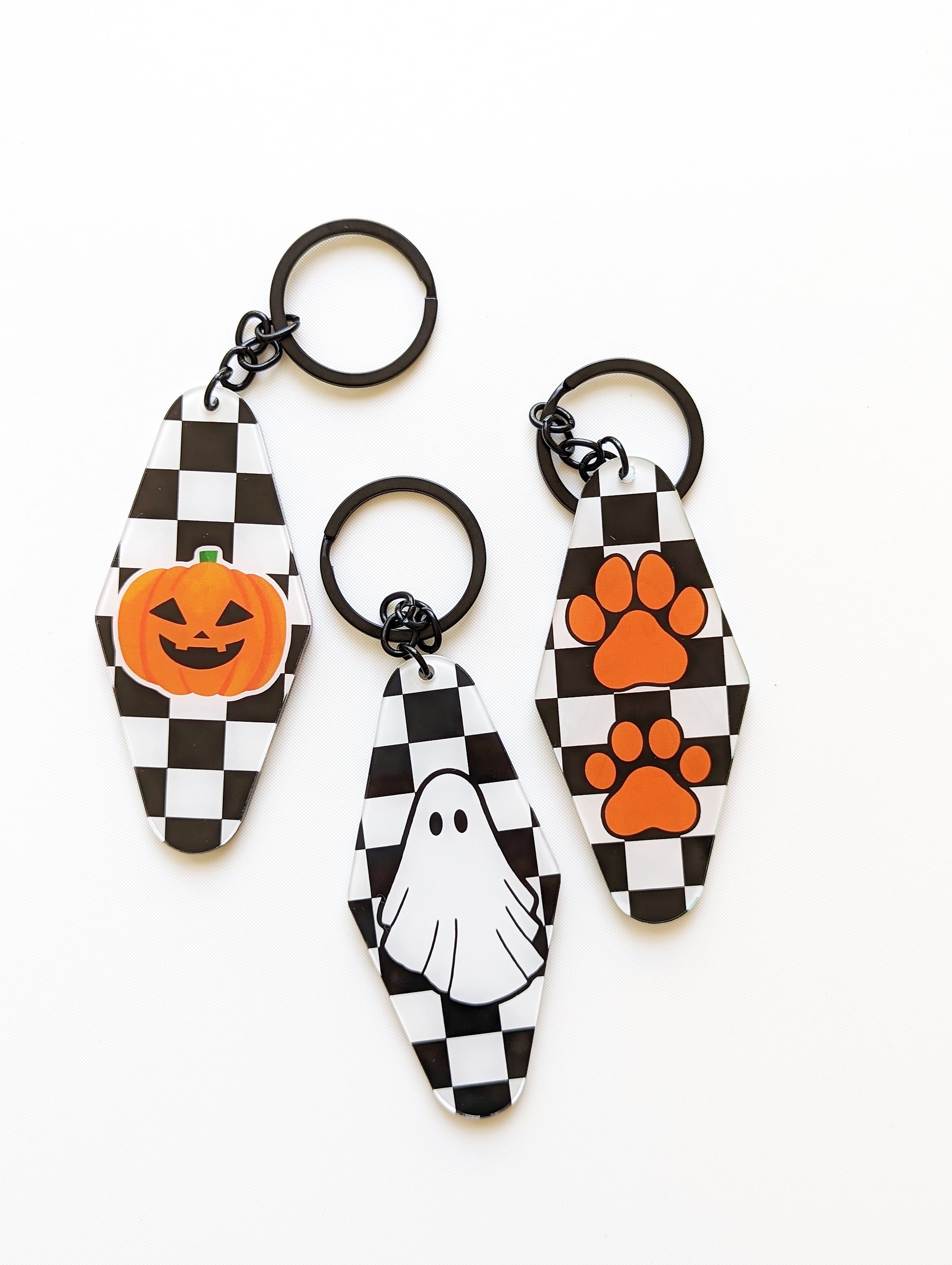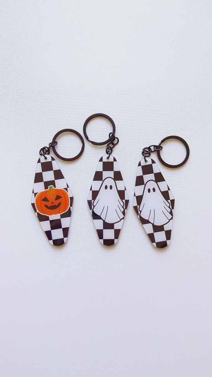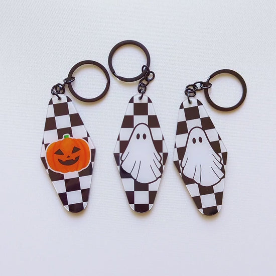 This Halloween Plaid Acrylic Keychain Series includes three adorable double-sided keychains, each with a fun design on classic black-and-white plaid: