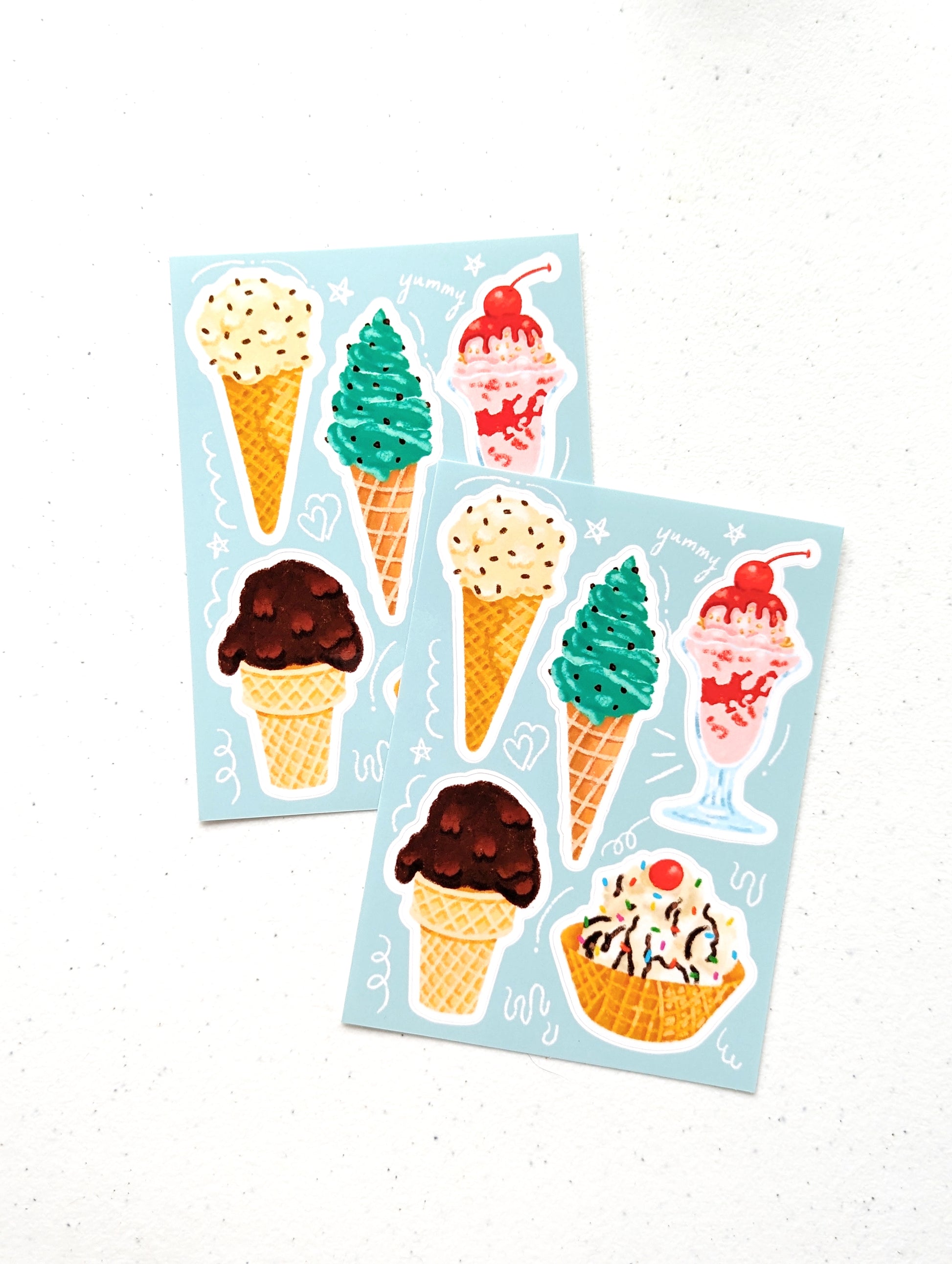 Indulge in a sweet treat with the Ice Cream Dream Sticker Sheet! This adorable collection features hand-drawn illustrations of five different ice cream treats, including waffle cones, soft serve, sundaes, and a cherry-topped float. Perfect for adding a pop of color to planners, notebooks, scrapbooks, and more! Made with high-quality, waterproof vinyl, these stickers are both durable and delightful.