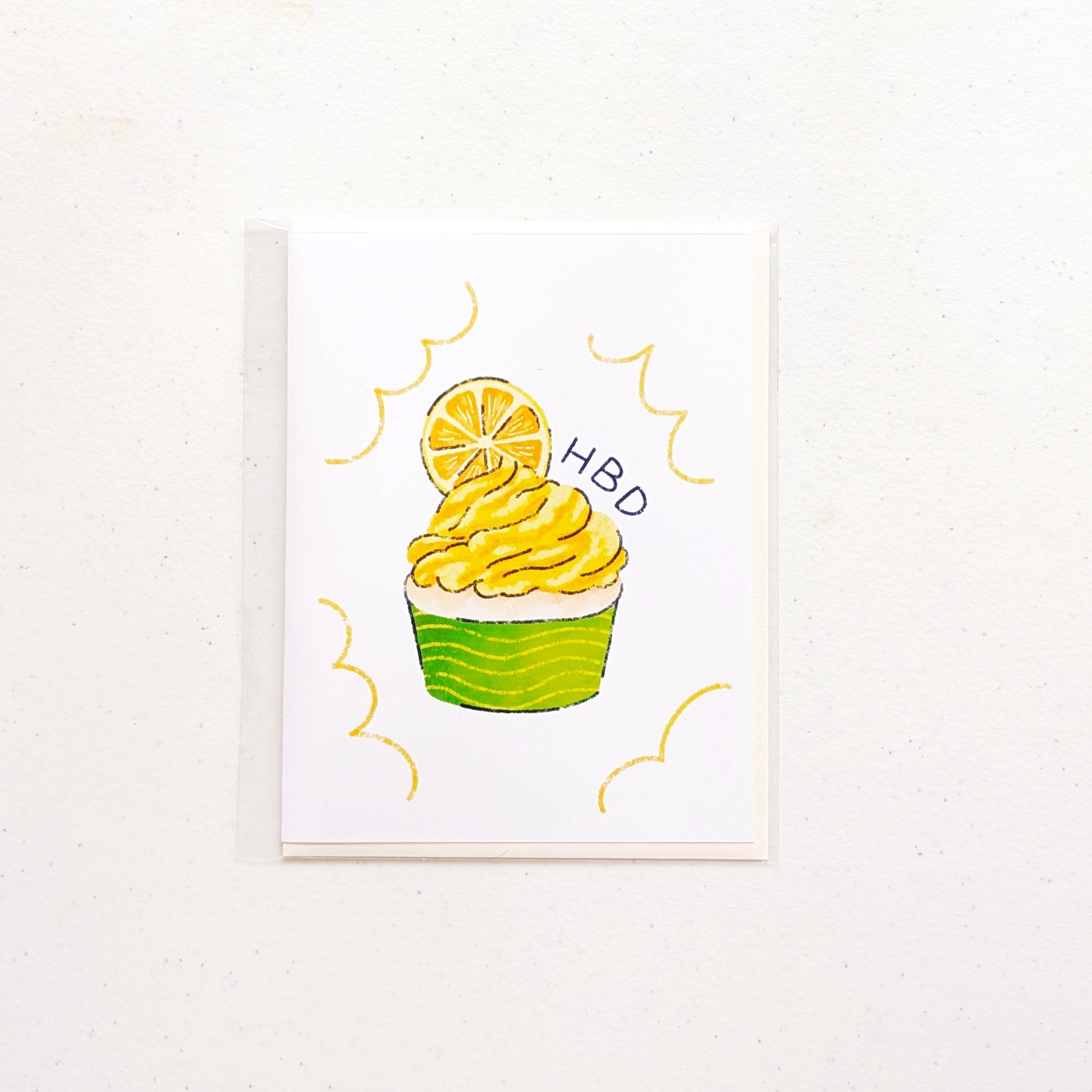 Celebrate birthdays with a sweet touch! This illustrated birthday card features a cheerful lemon cupcake topped with swirled yellow frosting, and a slice of lemon. "HBD" (Happy Birthday) is playfully written next to the candle for a fun, modern vibe. Perfect for friends, family, coworkers, or anyone who deserves a little sweetness on their special day.